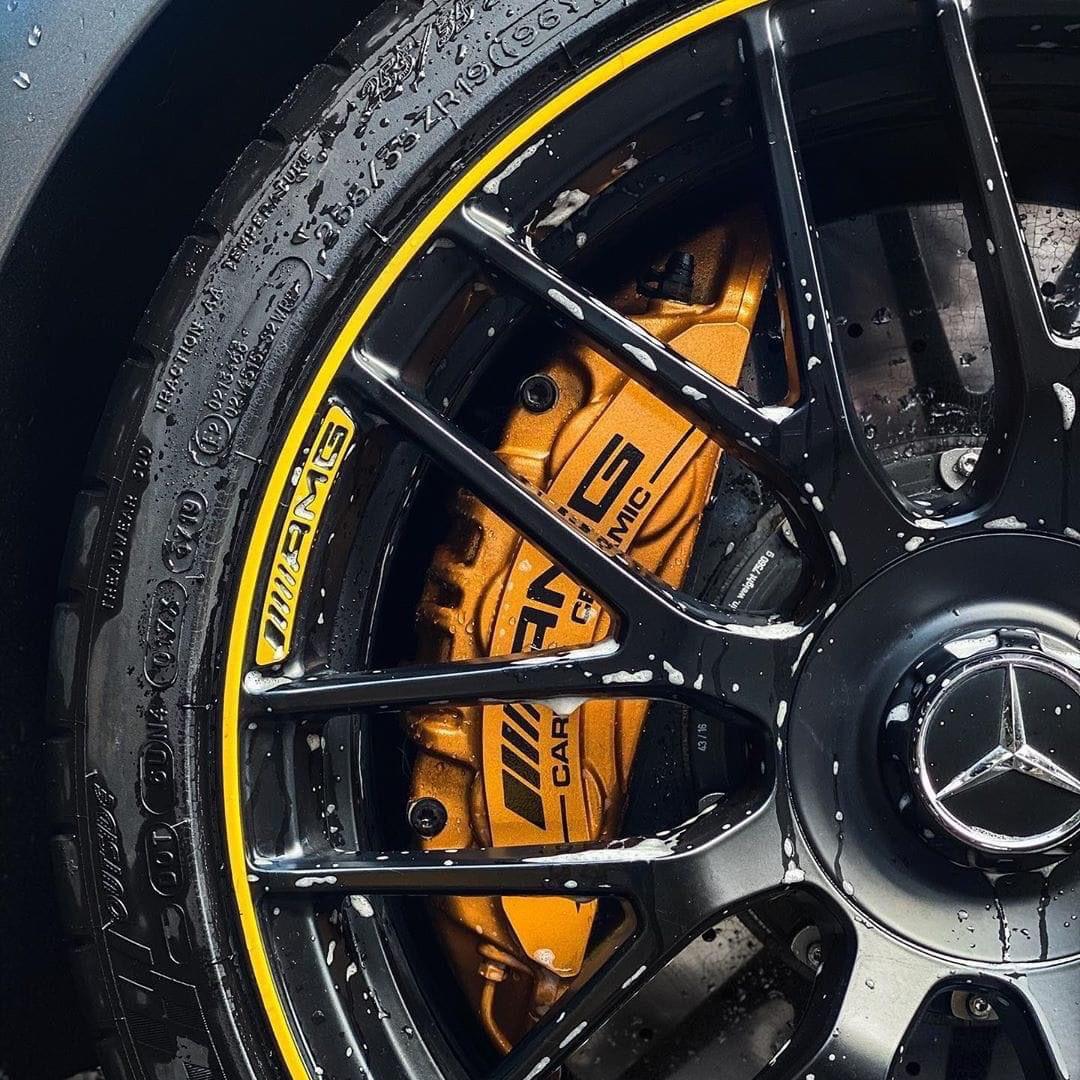Das Fahrzeug wird gründlich von hartnäckigem Schmutz befreit, indem ein materialfreundlicher Schmutzlöser auf Lack und Felgen aufgetragen wird. Anschließend wird grober Schmutz mit Hochdruck abgedampft. Die Handwäsche erfolgt mit pH-neutralem Shampoo und einem doppelt-Eimer System, um Kratzer zu vermeiden. Felgen werden mit einem säurefreien Reiniger und speziellen Bürsten gereinigt. Verschiedene Bereiche des Fahrzeugs werden gereinigt und Kunststoffteile gepflegt. Das Fahrzeug wird mit einem Vehicle Dryer getrocknet und mit Finish Detailer Wachs Schnellversiegelung versiegelt.